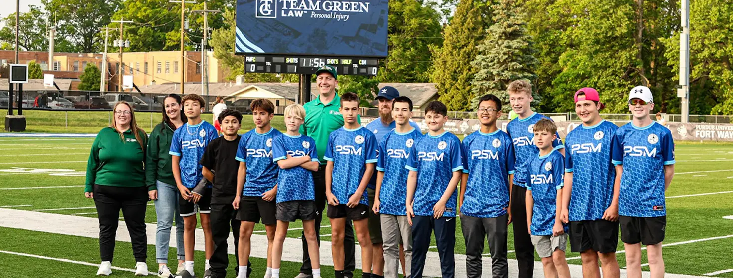 As part of our commitment to supporting youth athletics in Northeast Indiana, Team Green Law is proud to partner with Fort Wayne FC as the sponsor of the Team of the Match. At every Fort Wayne FC home game, we honor a local youth sports team by donating tickets for the entire team and recognizing them during a special halftime presentation. This ongoing program allows us to spotlight the dedication, sportsmanship, and passion of young athletes in our community.